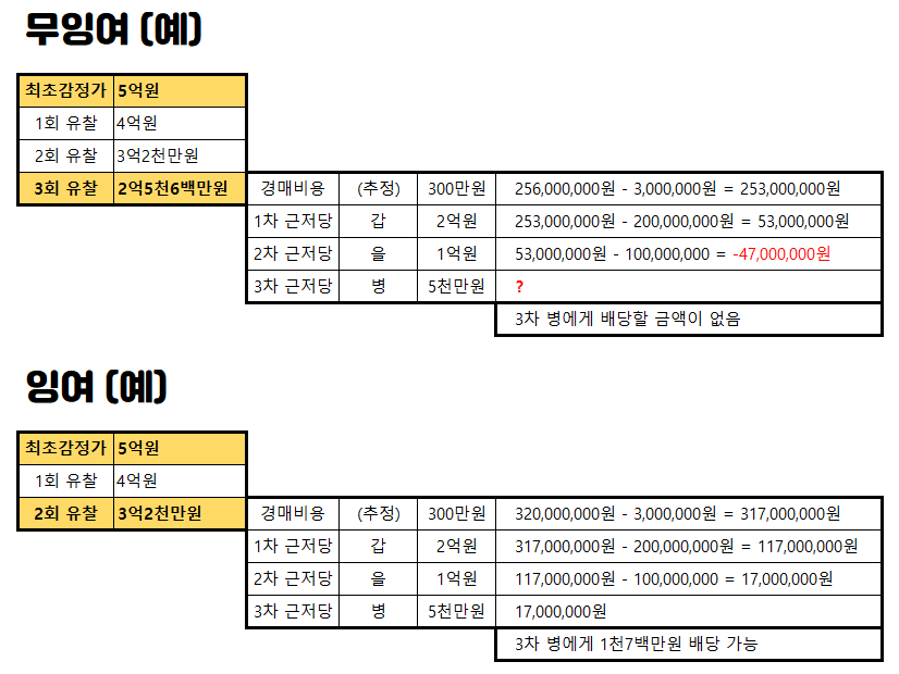 예를 들어 설명해보자면, 감정가 3억 원 하는 아파트가 경매 물건이 있습니다. 해당 아파트에 1순위 근저당권 3억 원, 2순위 근저당권 3억 원이 설정되어 있습니다. 만약 1순위 근저당권자가 경매를 신청했다면 경매는 10번이고 20번이고 유찰될 수 있습니다. 1천만 원에 낙찰이 되어도 그 근저당권자가 배당을 받을 수 있기 때문입니다. 반면에 2순위 근저당권자가 경매를 신청했다면 사실상 감정가 3억 원에 낙찰이 되어도 매각이 불허가 내지는 취소됩니다.